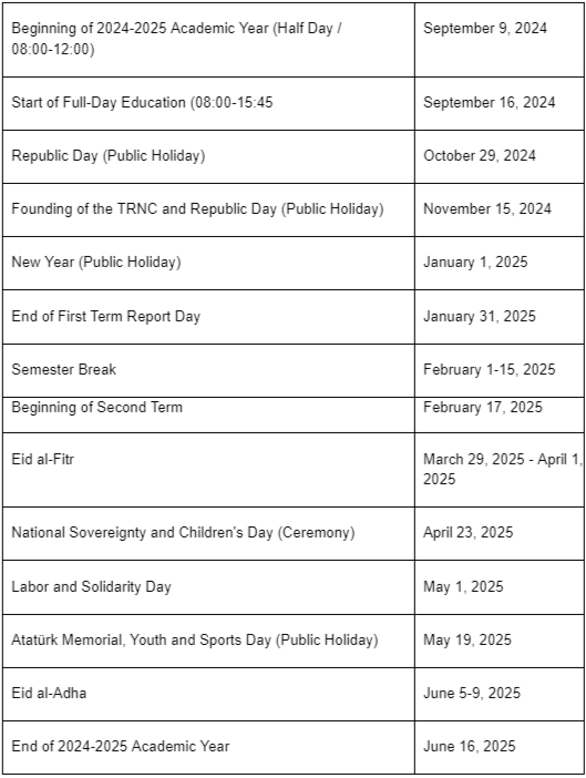 The academic year begins in September, and the first term ends in late January. The second term begins on February 17th and concludes in June. Our school is closed during official holidays. The event calendar is shared with parents weekly through agendas.