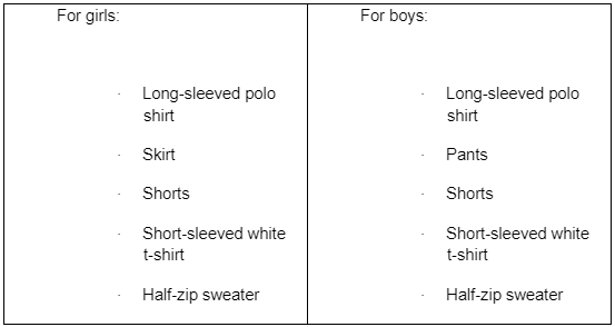 Each student receives a uniform set at the beginning of each academic year, containing the following: