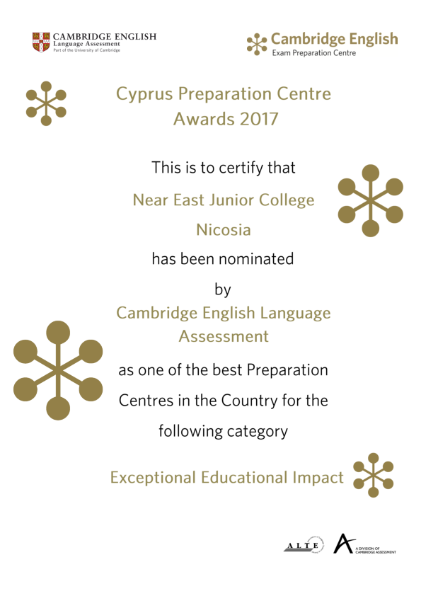 Yakın Doğu İlkokulu "Cambridge English Language Assessment" tarafından yukarıdaki belge ile takdir edilerek 2017 yılında ülkenin en iyi hazırlık merkezlerinden biri olmuştur.